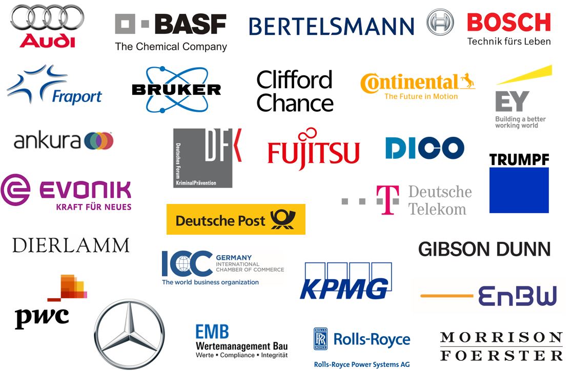 Ankura Consulting GmbH, Audi AG, BASF SE, Bertelsmann SE & Co. KGaA, Bruker Daltonics GmbH & Co. KG, Clifford Chance Partnerschaft mbB, Continental AG, Deutsche Telekom AG, Deutsche Post AG, Deutsches Netzwerk Wirtschaftsethik – EBEN Deutschland e. V., Deutsches Forum für Kriminalprävention (DFK), DICO – Deutsches Institut für Compliance e. V., Dierlamm Rechtsanwälte, EnBW Energie Baden-Württemberg AG, Ernst & Young GmbH Wirtschaftsprüfungsgesellschaft, EMB-Wertemanagement Bau e. V., Evonik Industries AG, Fraport AG, Fujitsu Technology Solutions GmbH, Gibson Dunn & Crutcher LLP, ICC Germany e. V., KPMG AG Wirtschaftsprüfungsgesellschaft, Mercedes-Benz Group AG, Morrison & Foerster LLP, PricewaterhouseCoopers GmbH Wirtschaftsprüfungsgesellschaft, Robert Bosch GmbH, Rolls-Royce Power Systems AG, TRUMPF SE + Co. KG, Rechtsanwalt – Dr. Andreas Wirth.
