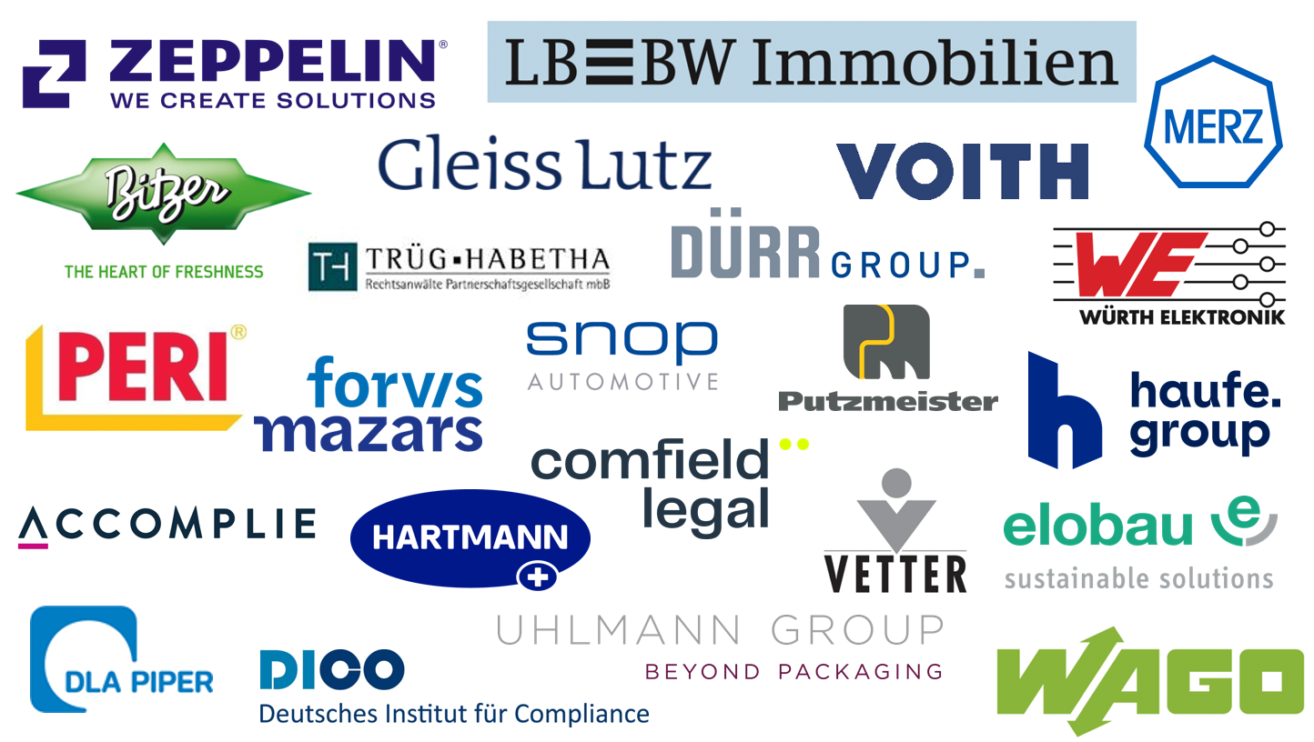 ACCOMPLIE, Bitzer SE, Comfield Legal, DICO e.V., DLA Piper UK LLP, Dürr AG, ensian group GmbH, Forvis Mazars Advisors GmbH & Co. KG, Gleiss Lutz Hootz Hirsch PartmbB, Haufe-Lexware Services GmbH & Co.KG, LBBW Immobilien Management GmbH, Merz Asset Management Holding GmbH & Co. KG, PAUL HARTMANN AG, PERI SE, Putzmeister Holding GmbH, Snop Automotive Cologne GmbH, Trüg Habetha Rechtsanwälte PartG mbB, Uhlmann Group Holding GmbH & Co. KG, Vetter Pharma-Fertigung GmbH & Co. KG, Voith GmbH & Co. KGaA, WAGO Kontakttechnik GmbH & Co. KG, Würth Elektronik GmbH & Co. KG, Zeppelin GmbH